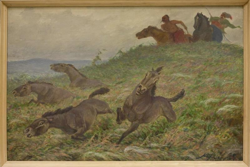 Полотно горизонтального формата, основная колористическая гамма холодная. Изображены четыре тарпана, преследуемые конными запорожскими казаками. Динамика движения погони подчеркнута диагональным построением композиции. На первом плане справа налево вниз с холма скачут два тарпана темно-серой (мышастой) масти с короткой черной гривой и хвостом. Первый из них вытянул шею вперед, прижал уши и испуганно скосил назад глаза. На втором плане видны еще два тарпана, скачущие в высокой траве, практически скрывающей их. Справа на холме уже показались два всадника-преследователя. Первым едет на рыжей лошади молодой казак в красных шароварах, обнаженный по пояс. У него длинный чуб и усы. К поясу слева прицеплена сабля, в левой руке - плетка. За ним скачет старый казак на темно-серой лошади с белым пятном на лбу. У него длинные седые усы, на голове зелено-красная шапка-колпак. Он одет в зеленую рубаху и синие шаровары, подпоясанные широким красным поясом. За спиной казака видна изогнутая палка, возможно, лук. Холм, по которому скачут лошади, весь покрыт высокой зеленой травой, волнующейся от ветра. Вдали слева видны голубые холмы. Небо серое, сплошь затянутое облаками. Краски наложены пастозно, фактура мазка хорошо видна.