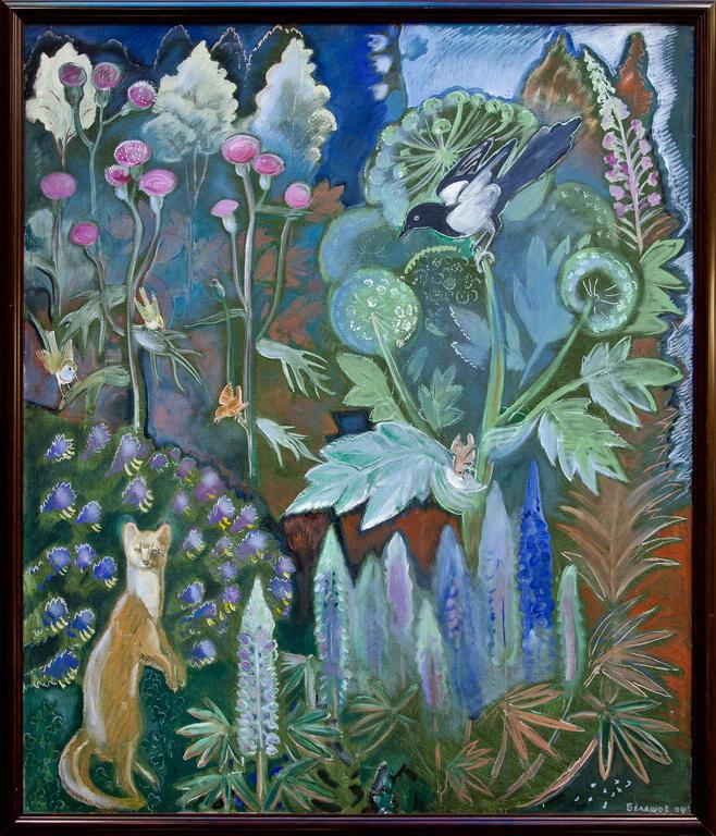 На тёмно-синем фоне представлены растения с яркими цветками ( васильковые, бледно-лиловые и голубые дельфиниума, розовые чертополоха, белые зонтичных) в увеличенных размерах. Их изображения условно-декоративные, в основе которого лежит реалистическое начало. Слева изображена в профиль стоящей на земле куница (голова повёрнута вправо). На стеблях чертополоха и зонтичного ратения (в разветвлениях) сидят птички (четыре особи).