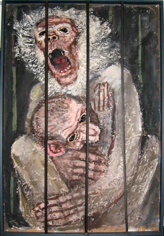 На картине вертикального формата изображена крупным планом обезьяна с детенышем, сидящая в клетке. Изображение представляет собой раскрашенный рельеф (монтажная пена?), голова и руки взрослой обезьяны вылеплены наиболее рельефно. Прутья клетки объемные, деревянные, выкрашенные в черный цвет. Они закреплены на раме на некотором расстоянии от картины. Всего использовано три прута. Обезьяна изображена фронтально, она обнимает руками своего детеныша, сидящего у нее между коленей. Голова ее покрыта всклокоченной белой шерстью. Пасть обезьяны страдальчески широко открыта, в ней видны зубы: два небольших белых клыка на верхней челюсти и ряд мелких зубов на нижней. Морда и руки обезьяны розоватые, тело светло-серое. Обезьяна плачет: ее глаза, нос и пасть влажно поблескивают от нанесенного сверху лака. Голова детеныша повернута в сторону зрителя, видно его розовое правое ухо со спирально закручивающимися ушными завитками. Правую ручку он положил на грудь своей матери. Глаза детеныша мокрые, из них вытекают слезы, сделанные при помощи лака. На морде белой краской нарисованы усы. Редкие волосы на голове малыша прочерчены рельефными бороздами. Фон локальный, темно-серый, на нем намечено зеленой краской три прута. Общий характер изображения крайне экспрессивный.