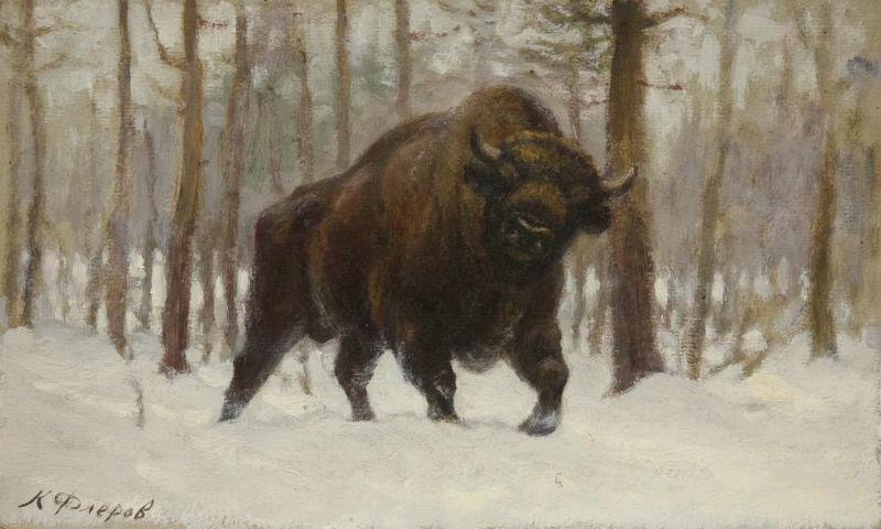 На картоне горизонтального формата на фоне зимнего пейзажа изображен зубр на ходу в фас. Бык выходит нам на встречу из лесной чащи.