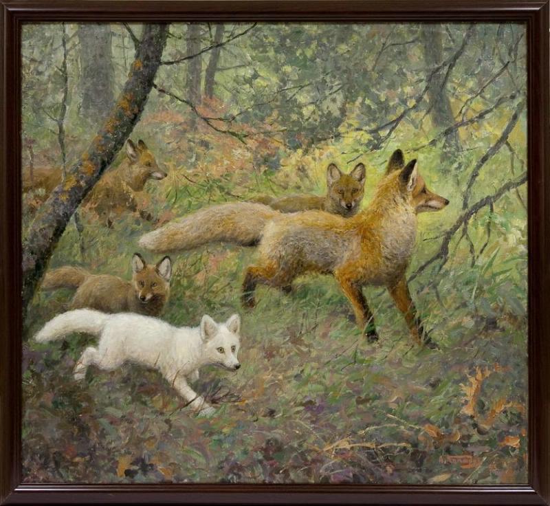 Формат полотна горизонтальный, близок к квадрату. На картине изображена лиса и четыре ее детеныша, идущие по лесу. Три лисенка нормально окрашены, а четвертый – альбинос. На первом плане слева крадучись пробираются два лисенка: впереди идет альбинос, а за ним – рыжий, нормально окрашенный. Белый лисенок-альбинос контрастно выделяется на фоне зеленой травы и бурых опавших листьев, лежащих на земле. Мочка его носа черная. Над лисятами плавно поднимается изгибающийся древесный ствол, покрытый рыжими лишайниками. На втором плане в центре картины изображена взрослая рыжая лиса. Она словно остановилась на секунду в настороженной позе: голова ее обращена вправо. За взрослой лисой виден еще один нормально окрашенный лисенок, его мордочка с чуткими ушами повернута в фас. Справа виднеется золотисто-желтое освещенное пространство. Слева из-за дерева выходит еще один рыжий лисенок. Его голова видна над травой, покрытой розовато-оранжевыми листьями. Земля на первом плане написана мазками зеленого, коричневого, рыжей охры и фиолетового. Стволы дальних деревьев серые. Краски наложены плотно, пастозно, фактура мазка хорошо видна.