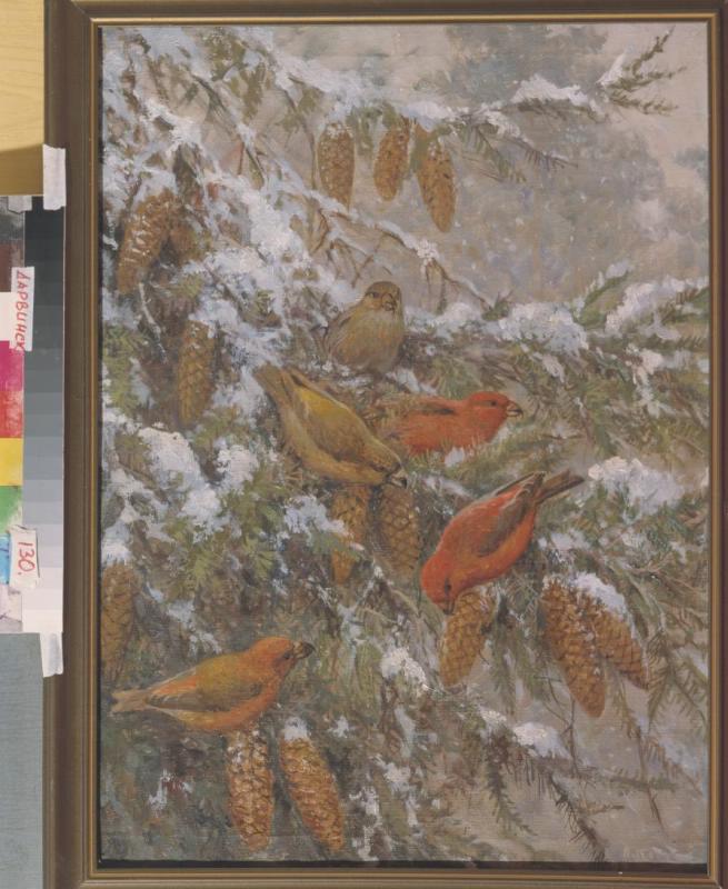 Картина вертикального формата. На заснеженных еловых ветках, усыпанных золотисто-коричневыми шишками, сидит стайка из пяти клестов. В центре картины изображены две желтовато-серые самочки и два оранжево-красных самца. Птицы заняты поиском семян в шишках. Еще один молодой оранжево-желтый самец устроился на еловой шишке в левом нижнем углу картины. Еловая хвоя написана различными оттенками зеленого и коричневого. В верхнем правом углу виднеются дальние, обобщенно написанные голубовато-зеленые хвойные деревья. Небо серое, идет снег. Краски наложены плотно, пастозно, особенно белила, изображающие снег.