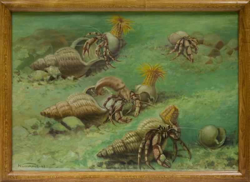 На картине горизонтального формата изображены четыре рака-отшельника в процессе смены раковины. Сюжетом данной картины является классический пример симбиоза – рак-отшельник и актиния. Взрослый рак сам находит и переносит актинию к себе на раковину, в которой живет. Такое сожительство оказывается обоюдно выгодно. Актиния защищает рака от нападения рыб, для которых он представляет лакомую добычу. Рак-отшельник, активно перемещаясь по дну, создает более благоприятные условия для питания актинии, лишенной возможности самостоятельно передвигаться. Меняя раковину на более просторную, рак не забывает пересадить на нее «свою» актинию. При этом актиния, в ответ на сжатие клешней рака, сразу же отцепляется от субстрата и легко дает себя переместить на новое место. Очевидно, что на картине три раза изображен один и тот же рак с полосатыми ногами и клешнями, но в разные моменты одного процесса. Действие начинается в левом верхнем углу: рак-отшельник обнаружил пустую коническую раковину какого-то моллюска, лежащую на камнях. Сам он в это время находится в меньшей по размеру раковине, на которой сверху прикреплена желтая актиния. В центре композиции тот же рак, покинув свою старую раковину с актинией, перемещает свое мягкое изогнутое тело в новое, более просторное жилище. Внизу справа тот же рак-отшельник, благополучно надев новую раковину, сажает на нее сверху свою желтую актинию, которую он снял со старой раковины, лежащей рядом. Справа наверху изображен еще один, меньший по размерам рак-отшельник, прячущийся в старую раковину, но еще без актинии. Фоном служит изумрудно-зеленое морское дно. Краски наложены тонкими лессировочными слоями.
