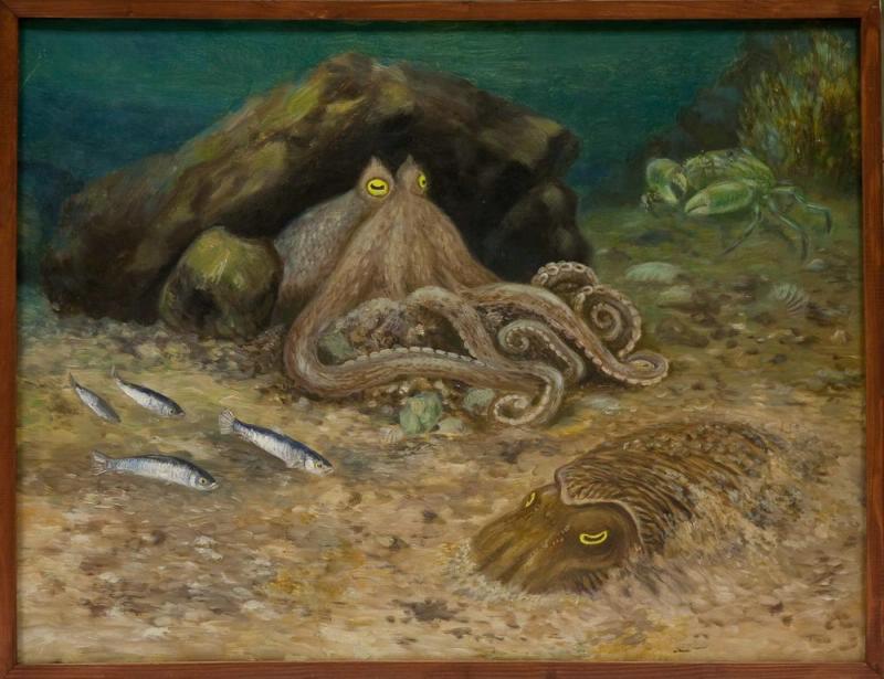 На картине горизонтального формата изображено морское дно с его обитателями. На первом плане справа лежит полузарывшись в песок каракатица. Ее окраска прекрасно гармонирует с охристо-коричневатым цветом песчаного дна, покрытого небольшими камешками. Слева проплывает стайка из четырех небольших серебристых рыбок. В центре композиции изображен большой серовато-коричневый спрут, лежащий под большим темно-коричневым валуном. Щупальца его покойно лежат на небольшом валу, образованном песком и камешками, которые он сам подгреб к себе спереди. Справа в отдалении виден зеленоватый краб, идущий по морскому дну, покрытому камешками и обломками раковин. За ним видны подводные камни, поросшие водорослями. Верхняя часть картины занята изображением толщи изумрудно-зеленой морской воды. Краски наложены плотно, фактура мазка почти не заметна.
