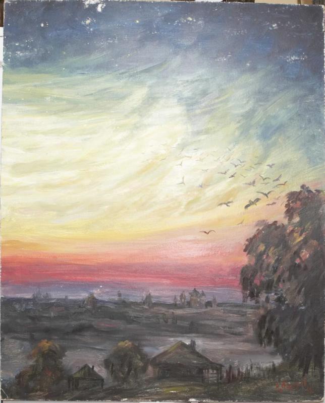 : Картина вертикального формата является правой частью триптиха, изображающего вечерний пейзаж: вид на закатное небо над городом, расположенным на противоположном берегу реки. Основная колористическая гамма полотна холодная. На первом плане находятся два маленьких черно-зеленых деревянных домика на берегу реки, рядом с которыми растут два небольших деревца. Справа возвышается другое дерево, крона которого написана мазками черного, зеленовато-серого и красно-коричневого цвета. За домиками изображена серая река, ее дальний берег темно-серый, написанный в контражуре. На нем виднеются неопределенные постройки, а также луковичные купола церкви. Линия горизонта расположена низко, большую часть композиции занимает небо. Оно постепенно меняет свой цвет: внизу оно фиолетовое и насыщенное лилово-красное, далее желтое, светло-зеленое и голубое, а наверху темно-синее. На темно-синем фоне контрастно выделяются маленькие светло-желтые и белые точки – звезды. В центральной части написаны легкие светящиеся желтовато-белые облака. Справа на их фоне летит большая стая птиц. Краски наложены плотно, экспрессивно, фактура мазка хорошо видна.