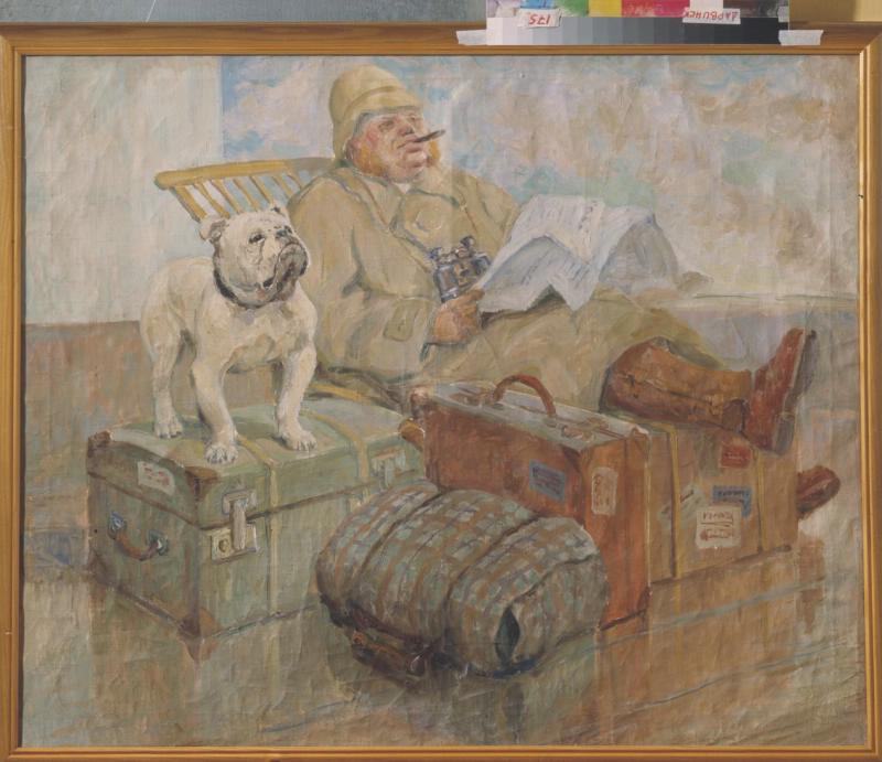 Картина горизонтального формата, основная колористическая гамма теплая. Изображен белый английский бульдог со своим хозяином. В центре композиции на желтом деревянном стуле сидит мужчина, одетый в светлый желтовато-серый плащ. На ногах у него коричневые сапоги (или рыжие ботинки и высокие застегнутые сбоку гетры). На голове – светло-желтый пробковый шлем, на груди висит черный бинокль. Лицо гладко выбрито. Мужчина курит сигару и читает газету, положив свою правую ногу на стоящий перед ним чемодан с множеством разноцветных наклеек. Слева стоит еще один коричневый чемодан, светло-зеленый сундук с металлическими застежками и лежит на боку зеленый клетчатый саквояж. На сундуке, подняв голову, стоит бульдог. Все вещи лежат на блестящих мокрых охристо-зеленоватых досках палубы или пристани. Слева на втором плане видна белая стена, а справа – светло-голубое небо в легких светло-серых облаках. Краски наложены плотно, фактура мазка хорошо видна.