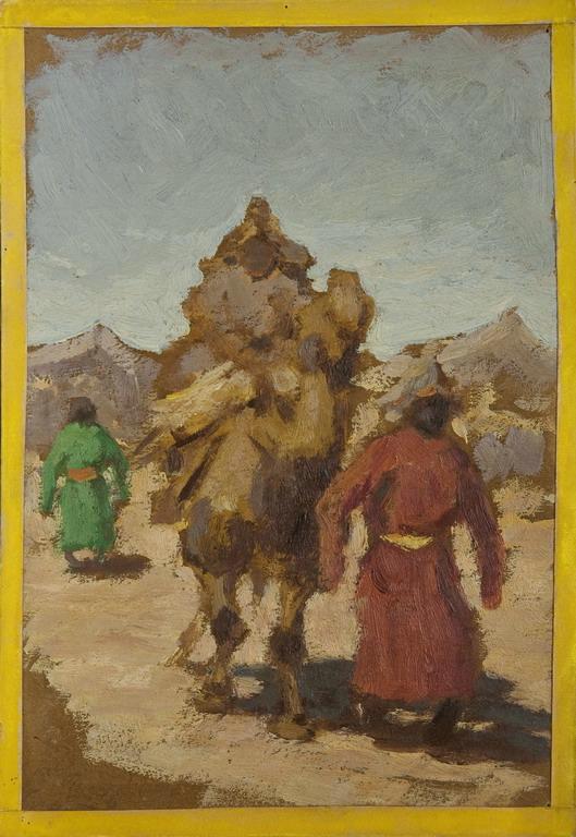 На картоне вертикального формата в пейзаже изображен всадник на верблюде, верблюда в поводу ведёт человек, одетый в ярко-красный халат, подпоясанный желтым кушаком и серый головной убор. Всадник одет в серую одежду, за ним видна фигура человека в ярко-зелёном халате. На дальнем плане изображены горы и серо-голубое небо. Этюд выполнен крупными размашистыми мазками, сквозь красочный слой просвечивает основа, особенно по краям.