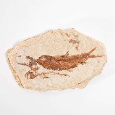 Скелеты костистых рыб Knightia alata с сохранившимися контурами тела, плавниками и покровами. Один экземпляр с фрагментами двух других на едином субстрате. Эоцен.