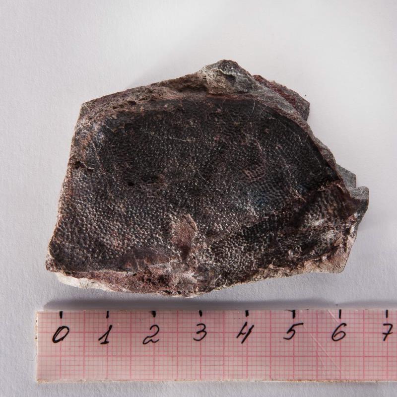 Нижняя челюсть (фрагмент) на субстрате. Кистеперые рыбы. Uzunbulaklepis obruchevi Vorobyeva et Panteleyev, 2005 ГОЛОТИП