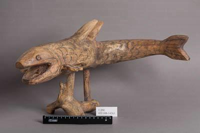 Скульптурное изображение плывущей рыбы на подставке в виде коряги. Хвост рыбы С-образно изогнут влево, пасть открыта. Спинные плавники обозначены 2 сучками, присутствуют также 2 грудных плавника. Глаза, жабры и зубы обозначены углубленным рельефом. Чешуя нарисована краской серого цвета.