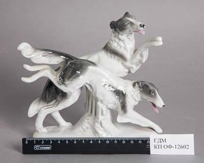 Скульптурное изображение двух перепрыгивающих через препятствие борзых на подножии. Левая собака стоит на задних ногах, причем правая чуть отставлена назад, передние лапы вытянуты вперед и находятся в возхдухе. Грудью борзая опирается о препятствие, составляющее одно целое с подножием. Голова поднята вверх и слегка повернута направо, взгляд направлен вверх, пасть приоткрыта, виден розовый язык. Правая собака опирается грудью на препятствие, ее задние ноги находятся в воздухе, а передние вытянуты вперед и едва касаются подставки. Голова опущена вниз и слегка повернута направо, пасть приоткрыта. Обе борзые белые с серыми пятнами, глаза и носы - черные, языки розовые. Фактура длинной шерсти собак передана рельефом. Подножие белого цвета, составляет со скульптурой одно целое.