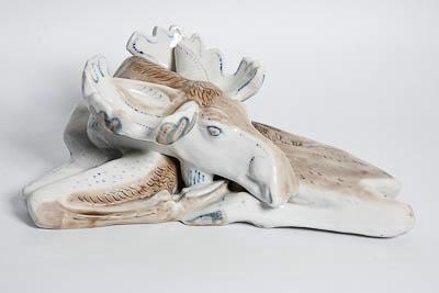 Скульптурное изображение лося без подножия. Животное лежит на правом боку, поджав под себя согнутые ноги. Рогатая голова лося повернута налево. Фактура шерсти передана в углубленном рельефе. Спина, задние ноги, рога, шея и голова сверху тонированы светло-коричневым цветом. Контуры рогов, копыт и глаза на скульптуре подчеркнуты тонировкой голубого цвета.