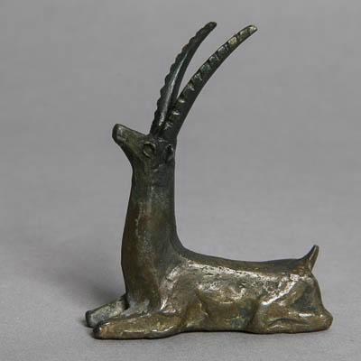 Скульптурное изображение лежащей антилопы без подножия. Поза - лежа, шея вытянута вертикально, голова смотрит вверх и немного влево. Рога длиннее головы более, чем в два раза, они покрыты поперечными зарубками; их концы слегка загибаются назад. Конечности подогнуты под туловище, короткий хвост поднят вверх.