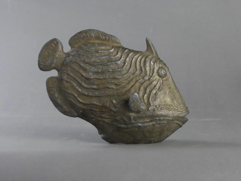 Скульптурное изображение рыбы (спинорога) без подножия. Тело рыбы плоское с боков, на спине - шип, за ним - спинной плавник. Хвостовой плавник небольшой, овальной формы. Фактура передает расположение цветовых пятен окраски рыбы. Данная скульптура идентична работе "Рыба зебристая" ОФ-7667/2049 (С-106).