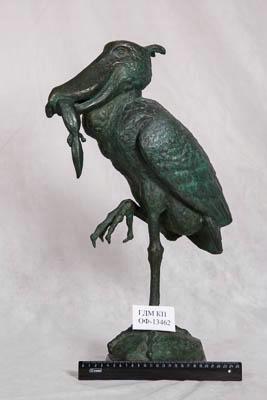 Скульптурное изображение птицы китоглава на подножии из камня чароита фиолетового цвета. Птица стоит на одной левой ноге; поджав правую. Голова втянута в плечи и поднята вверх, в массивном клюве зажата добыча - тритон. Крылья сложены и прижаты к бокам, хвост опущен вниз. Фактура оперения передана при помощи рельефа.