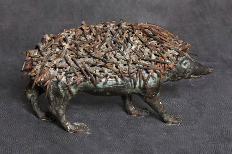 Скульптурное изображение стоящего ежа без подножия. Обе правые лапы животного несколько выставлены вперед, левые - отставлены назад. Спереди из-под иголок виднеется голова ежа: нос, глаза и уши. Скульптуротлита из бронзы, иголки сделаны из железных гвоздей, хаотично приваренных сверху.