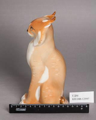 Скульптурное изображение сидящей рыси без подножия. Животное сидит выпрямившись, передние ноги поставлены вплотную друг к другу, задние поджаты. Уши с кисточками на концах наклонены назад, глаза открыты. Короткий хвост загнут налево. Рысь светлого охристо-палевого цвета, грудь, живот и концы лап - белые, белые пятна на бровях, ушах и щеках. Мочка носа и глаза - черные, кончик хвоста - коричневый.