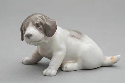 Скульптурное изображение щенка пойнтера. Поза - сидя, передние лапы широко расставлены, правая задняя подвернута. Хвост короткий, повернут влево, голова повернута влево. Подглазурная роспись: серовато-белого цвета с крупными серыми пятнами.