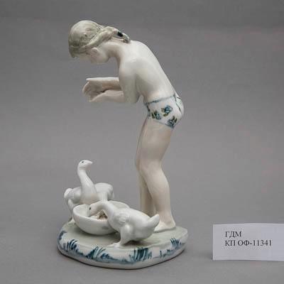 Скульптурное изображение стоящей маленькой девочки на подножии. Девочка стоит, слегка наклонившись вперед и опустив вниз голову, взгляд направлен на ладони рук. Руки полусогнуты в локтях, ладони рядом. Девочка пересыпает чтот-то с правой ладошки на левую. Девочка одета в белые трусики в синий цветочек. Светло-русые волосы девочки заплетены в короткую косичку. Перед босыми ногами девочки на земле стоит белая миска, вокруг котрой стоят три гусенка. Две птицы клюют из миски, одна стоит, подняв вверх голову. Гусята белые с голубыми глазами. Тело девочки светло-телесного цвета, подножие серовато-зеленое, по его периметру нарисована штрихами трава.