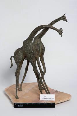 Скульптурное изображение 2 жирафов на подножии из каменной пластины неправильной формы. Животные стоят бок о бок, соприкасаясь длинными шеями. Жираф слева опустил голову вниз, С-образно изогнув шею; передние ноги поставлены параллельно, задние - широко расставлены. Правый жираф стоит, выставив вперед правую переднюю ногу и отставив заднюю; левые ноги сближены; шея вытянута вперед и вверх. Пятнистая окраска жирафов передана при помощи фактуры. Подставка сделана из камня желтовато-розового цвета с прожилками.