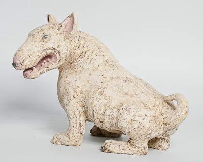 Скульптурное стилизованное изображение бультерьера без подножия. Животное сидит, повернув голову налево. Передние лапы расставлены, хвост закинут наверх на спину. Пасть приоткрыта, видны зубы. Скульптура светлая, почти белая, с темными углублениями. Пасть и уши изнутри, область вокруг мочки носа и подушечки лап - розовые. Глаза, нос и когти - черные.