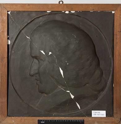 Гипсовый барельеф квадратной формы с профильным, портретным изображением Бернара де Жюссьё (1699 - 1777) в круглом медальоне. Профиль обращен налево. На голове - парик, волнистые волосы зачесаны назад и собраны на спине. Изображен в некой обобщенной одежде с отложным воротником. Барельеф тонирован в черный цвет.