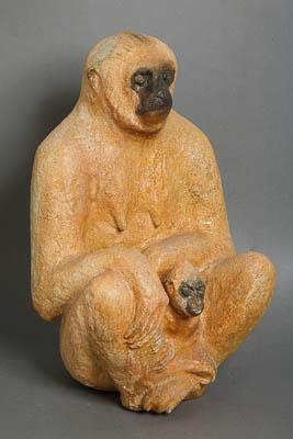 Скульптурное изображение взрослого гиббона с детенышем без подножия. Поза - сидя, колени подняты и разведены немного в стороны, стопы сложены вместе; правая рука лежит на правой ноге, кисть спускается ниже колена; левая рука согнута в локте и прижата к животу. Между коленями взролой обезьяны сидит детеныш, держащийся руками за правую голень матери. Видны только его голова, верхняя часть туловища и кисти рук. Скульптура окрашена в светлый охристио-желтый цвет, лицо взрослой обезьяны и детеныша окрашены в черный. Внутри скульптура полая.