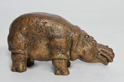 Скульптурное изображение стоящего бегемота без подножия. Все 4 конечности поставлены параллельно друг другу. Голова опущена вниз, глаза и ноздри широко открыты. Складки кожи переданы рельефом.