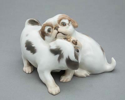 Скульптурное изображение двух играющих щенков японского хина. Один щенок - сидя, передние лапы широко расставлены, голова повернута влево, смотрит вверх, лежит на спине на другого щенка. Второй щенок припал на передние лапы, голова повернута влево и смотрит вверх. Щенки белого цвета с пятнами: сидящий щенок с коричневыми, припавший на передние лапы - с серыми, концы лап слегка желтоватые.