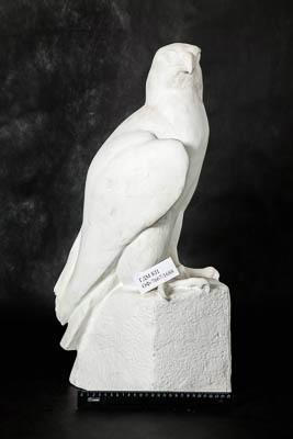 Скульптурное изображение кречета, сидящего на подножии в виде камня. Крылья птицы сложены и прижаты к туловищу, хвост опущен и прижат к скале. Голова поднята и повернута направо, глаза открыты. Лапы с острыми когтями поставлены рядом. Основание в виде камня имеет прямоугольную форму, составляя со скульптурой одно целое. Оперение кречета передано при помощи фактуры. Скульптура белого цвета.