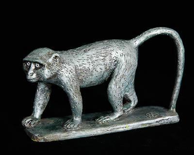 Скульптурное изображение зеленой мартышке на прямоугольном подножии. Обезьяна идет, выставив вперед правую переднюю лапу, и отставив назад правую заднюю. Хвост, дугообразно изгибаясь, опущен вниз, его конец касается подставки. Фактура шерсти передана короткими штрихами-углублениями. Рельеф подчеркнут окраской: углубления черные, выступающие поверхности покрашены серебристой краской. (Возможно, применялся восстановительный обжиг, т.к. подставка снизу черного цвета).