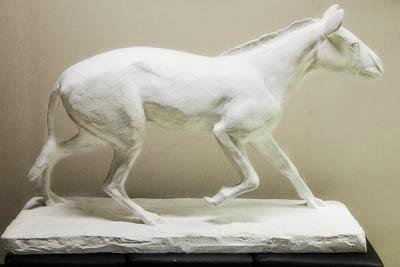 Скульптурная реконструкция предка лошади. Поза - стоя, правые конечности, передняя и задняя, сближены; передняя правая согнута и приподнята; левая передняя выдвинута вперед, левая задняя отставлена назад. Голова поднята, смотрит вперед, хвост опущен. Скульптура составляет единое целое с гипсовым прямоугольным в плане подножием.