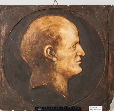 Гипсовый барельеф квадратной формы с профильным, портретным изображением Этьена Жоффруа Сент-Илера (1772-1844 гг.) в круглом медальоне. Профиль обращен направо. Шея снизу отсечена изогнутой линией. Барельеф тонирован в коричневый цвет: фон темный, сам профиль - светлый в лецевой части и темнеющий к затылку и задней части шеи.