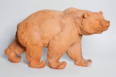 Скульптурное изображение идущего медведя-гризли без подножия. Голова слегка повернута направо; левая передняя лапа выставлена вперед, левая задняя - отставлена назад. Правые лапы сближены. фактура шерсти передана неровностями рельефа. Скульптура терракотового цвета.