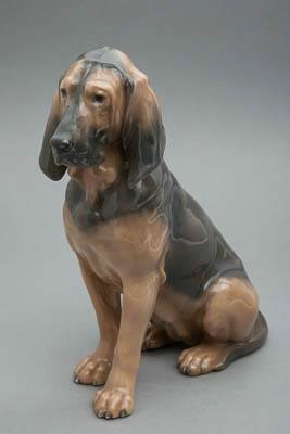 Скульптурное изображение собаки породы бладхаунд (сука). Поза - сидя, левая передняя нога немного выставлена вперед, хвост загнут влево, прижат к лапе. Голова чуть-чуть повернута влево. Собака светло-коричневого цвета; спина, затылок, морда, уши и верх груди - темно-серого цвета.