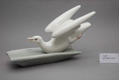 Скудьптурное изображение летящей чайки на прямоугольном в плане подножии. Птица изображена пикирующей вниз, она касается подставки-подножия своей грудью. Крылья подняты над спиной и полусложены, лапки прижаты к бокам.. Голова поднята вверх, клюв приоткрыт. Все формы скульптуры обтекаемые, гладкие. Птица белого цвета, подножие - голубовато-серое. Глазки темно-синие, клюв и лапки розоватые.