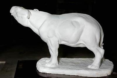 Реконструкция в натуральную величину древнейшего ископаемого предка хоботных на подставке неправильной формы. Поза - стоя, передние конечности сближены, задние расставлены шире; правая немного позади; хвост опущен вниз, отклонен вправо, касается задней правой ноги. Голова слегка повернута вправо, морда немного поднята вверх. Округлые уши насторожены, в пасти видны два коротких бивня, растущих из верхней челюсти. Подставке из того же материала, составляет одно целое со скульптурой.