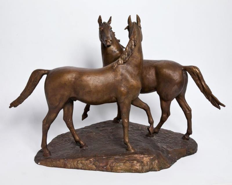 Скульптурная группа, изображающая 2 взрослых лошадей на подножии в виде земли. Животные стоят параллельно друг к другу, их позы зеркально отражают друг друга. Обе лошади подняли головы с настороженными ушами вверх и повернули налево, друг другу. У них у обеих приподнята в воздух согнутая в колене левая передняя нога, а правая задняя отставлена назад. Хвосты откинуты назад. Все это создает впечатление, что лошади кружаться вокруг друг друга. Подножие неправильной формы.