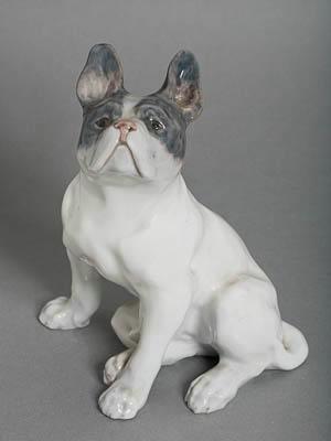 Скульптурное изображение собаки породы французский бульдог (кобель). Поза - сидя, завалившись на правое бедро, передние лапы на одной линии; хвост длинный, загнут влево. Голова поднята, смотрит вверх, повернута влево. Бульдог белый, уши, виски и область вокруг глаз темно-серые с с еще более темными поперечными полосами. Вдоль лба - узкая белая полоса, нос розовый, концы лап сероватые.