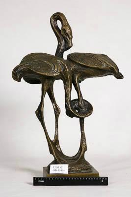Скульптурное стилизованное изображение двух фламинго, стоящих на подставке. Одна из птиц опустила голову на длинной шее вниз и обвила ею ногу другого фламинго. Вторая птица стоит, подняв изогнутую дугообразно шею вверх, взгляд ее направлен вниз, на первую птицу. Формы скульптуры утрированы. Оперение птиц передано условными бороздками.