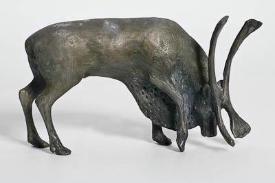 Скульптурное изображение северного оленя без подножия. Животное стоит, опустив рогатую голову вниз, и слегка повернув ее направо. Правой передней ногой олень роет землю: она слегка приподнята и чуть касается почвы только острым концом копыта. Правая задняя нога слегка выставлена вперед относительно левой. Поверхность скульптуры гладкая, фактура шерсти передана углублениями.