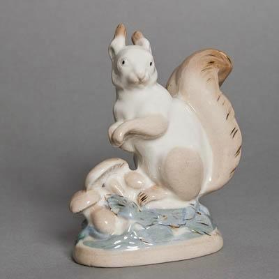Скульптурное изображение сидящей белки на подножии. Белка сидит на задних лапах, передние сложены вместе и вытянуты вперед. Голова белки повернута налево, взгляд направлен вперед. Перед белкой на подставке-основании растут пять пластинчатых грибов. Пушистый хвост, концы ушей, передние и задние лапы зверька тонированы светло-коричневым, также, как и шляпки грибов сверху и нижний край подставки. Трава на подножии зеленовато-голубая. Глаза белки черные, кончик морды вокруг носа светло-коричневый. Шерсть на ушах, хвосте, когти на лапах прорисованы штрихами позолоты. На траве позолотой намечены отдельные листочки. На изнанке шляпок грибов позолотой нарисованы пластинки.