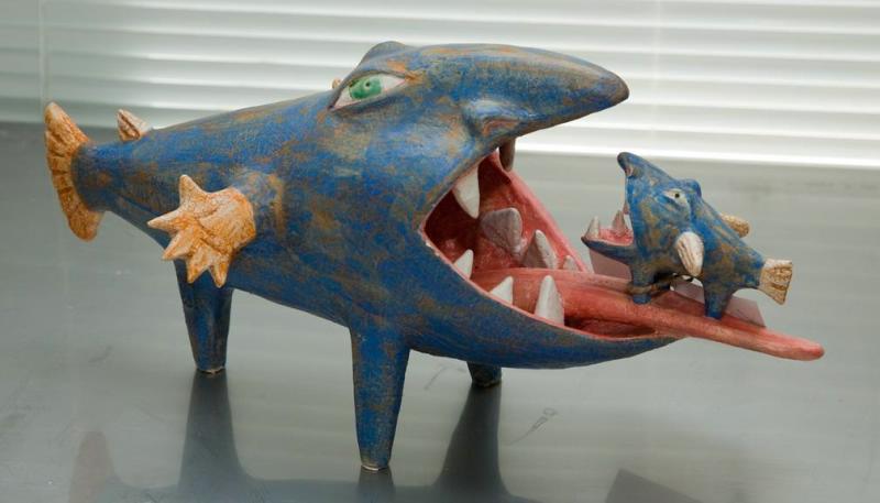 Скульптурное стилизованное изображение двух рыб, одна из которых сидит в пасти другой. Рыбы имеют антропоморфные черты, их головы напоминают человеческие лица. Тело большой рыбы коническое, по бокам торчат в стороны два плавника, напоминающих пятипалые руки, сзади - рыбий хвост и выступающий маленький спинной плавничок. На ладонях обозначены линии. Скульптура опирается на три ноги-плавника - две спереди и одну сзади. Глаза имеют веретенообразный разрез, спереди сверху морда оканчивается подобием большого человеческого носа. Пасть большой рыбы широко раскрыта, видны большие зубы - 2 клыка сверху, и 6 острых зубов снизу. Изнутри зев рыбы розовый. Между зубами высунут длинный розовый язык, на котором сидит маленькая рыбка, похожая на большую. Ее пасть также раскрыта, видны острые зубы - 2 сверху, 3 снизу. Обе рыбы синего цвета, поверх которого - сетка из золотисто-желтых тонких разводов. Плавники и хвост большой рыбы - светло-желтые в таких же золотистых разводах. Плавнички маленькой рыбы - белые с желтыми разводами. Зубы белые, глаза с белыми белками - светло-зеленые, зрачок передан углублением.