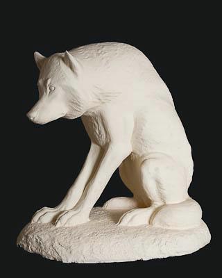 Скульптурное изображение сидящего волка на подножии. Голова слегка опущена и повернута влево, уши насторожены, глаза открыты, взгляд направлен вперед. Передние лапы поставлены рядом вплотную друг к другу и несколько вытянуты вперед, причем правая чуть впереди левой. Хвост лежит на подножии у левого заднего бедра. Скульптура тонирована в светлый желтовато-кремовый цвет.