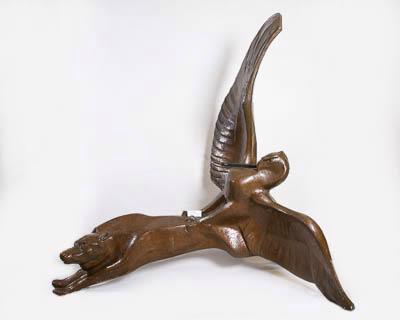 Скульптурное изображение беркута, поймавшего волка, без подножия. Волк бежит, вытянувшись в струнку, передние лапы вытянуты вперед, а задние назад. Голова с прижатыми ушами повернута слегка налево. Беркут вцепился когтистыми лапами в спину волка сзади сверху и откинулся назад, словно пытаясь затормозить движение жертвы. Крылья птицы широко раскрыты, конец левого касается земли, правое поднято вверх. Скульптура пустотелая, все формы обтекаемые, гладкие.