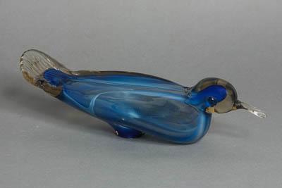 Стилизованное скульптурное изображение кулика. Поза - сидя, голова направлена вперед. Скульптура полая, изнутри стекло окрашено в синий цвет (голова и туловище); хвост и клюв прозрачные. Фактура перьев на хвосте передана защипами-углублениями.