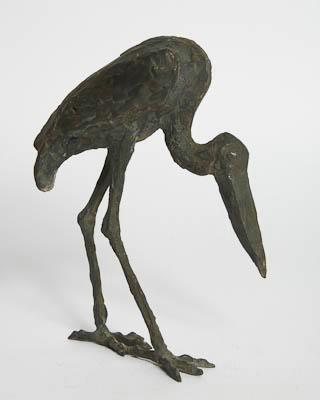 Скульптурное изображение стоящего марабу. Голова опущена вниз, правая лапка выставлена впереди левой. Взгляд направлен вниз.