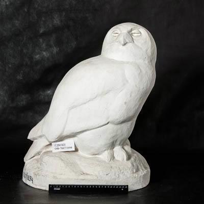 Скульптурное изображение белой полярной совы на подножии в виде земли. Поза - сидя, крылья сложены и прижаты к туловищу, хвост опущен вниз и лежит на подножии, покрытые перьями лапы поставлены рядом. Голова повернута вправо, веки полуприкрыты. Скульптура и подножие составляют одно целое.