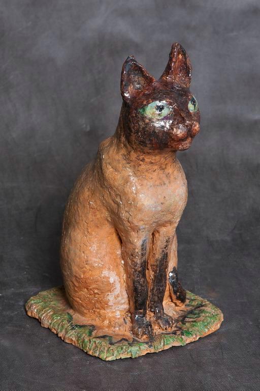 Сиамская кошка изображена сидящей в статичной позе. Взгляд больших зеленых глаз направлен вперед, уши насторожены. Зрачки переданы небольшими углублениями. Голова, передние лапы и хвост темно-коричневые, тело цвета светлой охры. Кошка сидит на маленьком зеленом с черным зигзагообразным узором коврике-подставке. По краям коврика хаотичными углублениями намечена бахрома.