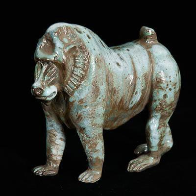 Скульптурное изображение обезьяны гамадрила без подножия. Поза - стоя на четырех конечностях, правая передняя выдвинута вперед, правая задняя отставлена назад. Голова направлена вперед и немного наклонена. Короткий хвост поднят вертикально вверх. Скульптура голубовато-коричневого цвета.